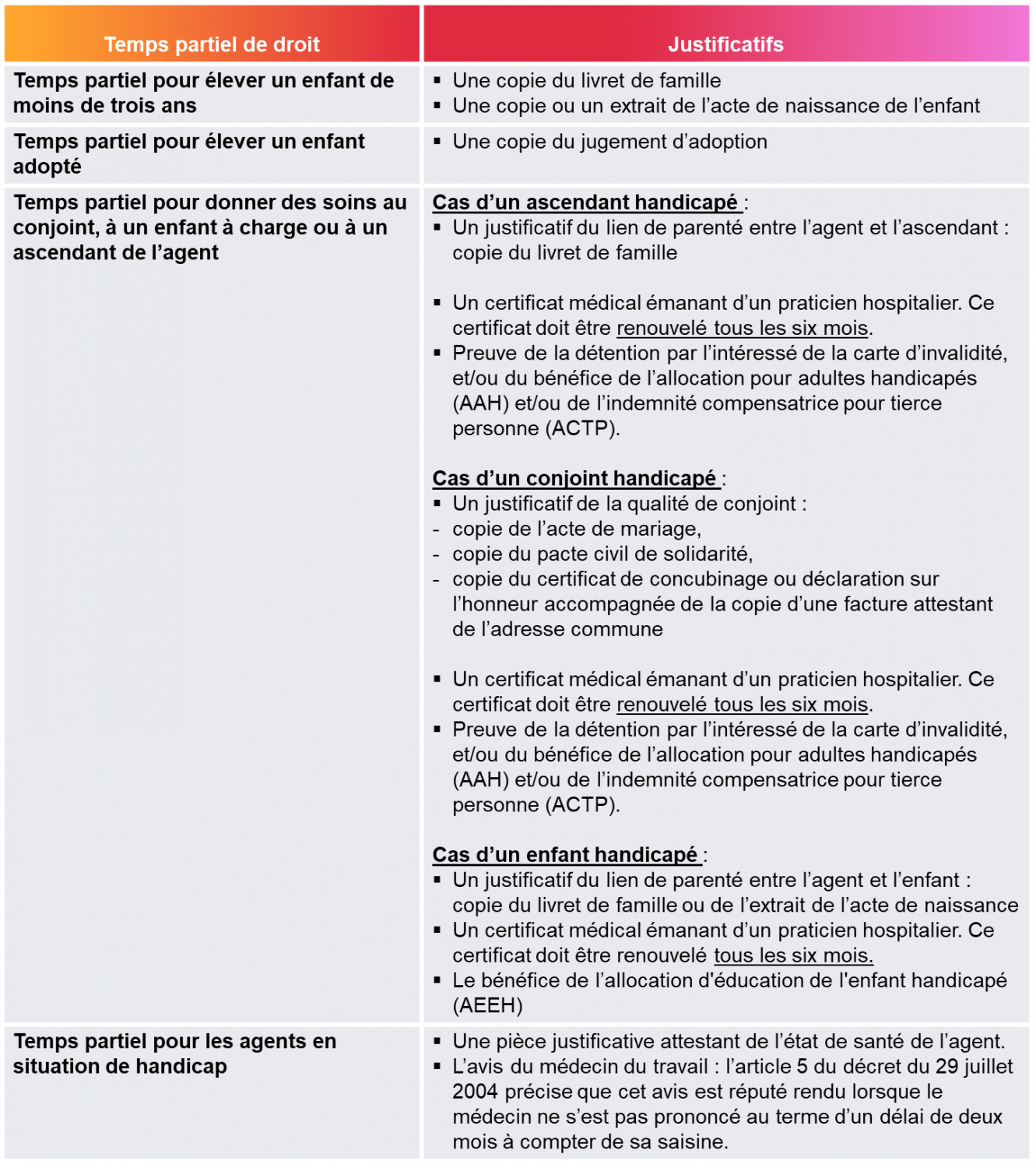Les pièces justificatives à joindre à la demande de temps partiel de droit :