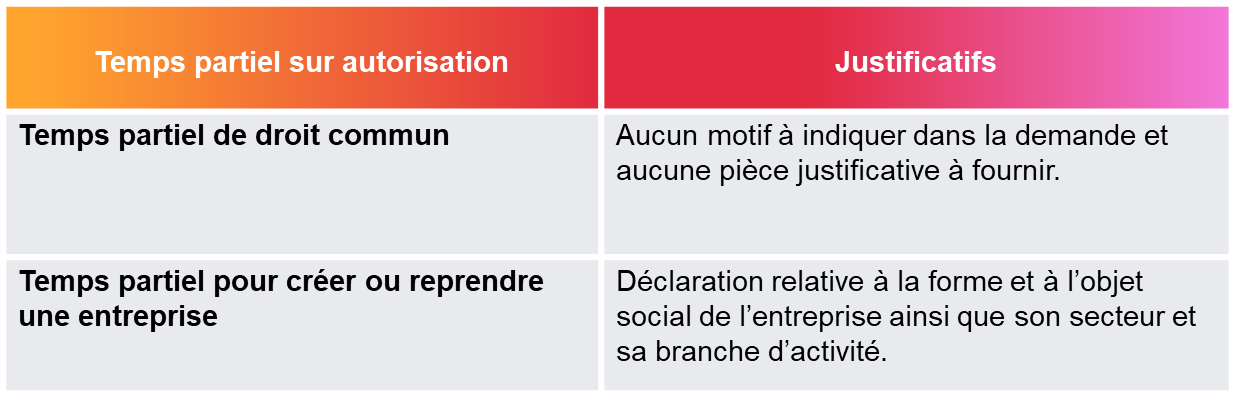 • Le motif du temps partiel et les pièces justificatives : temps partiel de droit et temps partiel sur autorisation pour créer ou reprendre une entreprise uniquement.