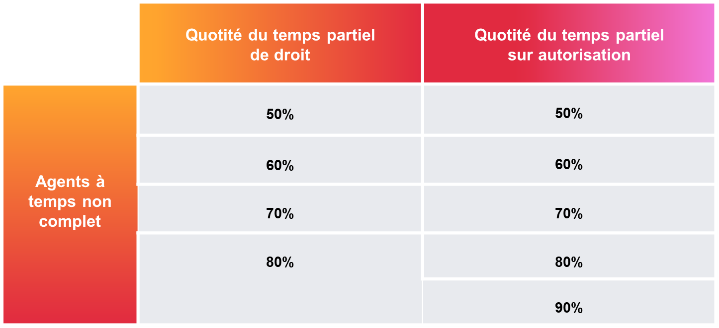 Il faut tenir compte de la nature de l’emploi, c’est-à-dire, le temps complet ou le temps non complet (voir question n°1), pour déterminer les quotités de travail admises (voir tableaux infra).