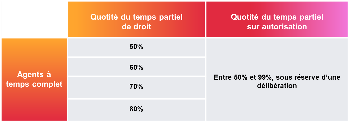 Sous réserve de remplir les conditions statutaires (voir question n°4) et les conditions posées par la délibération le cas échéant pour le temps partiel sur autorisation, les agents ci-dessous peuvent bénéficier d’un temps partiel :
