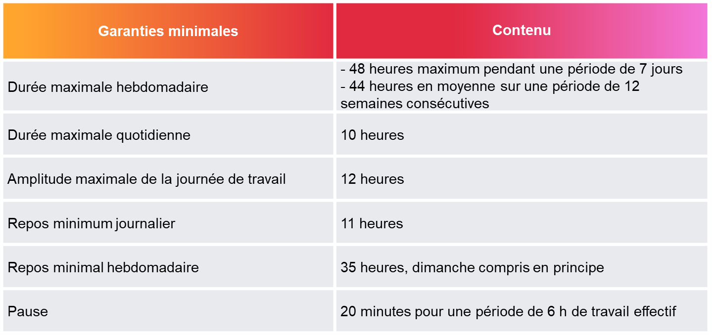 Tableau récapitulatif des garanties minimales du temps de travail :